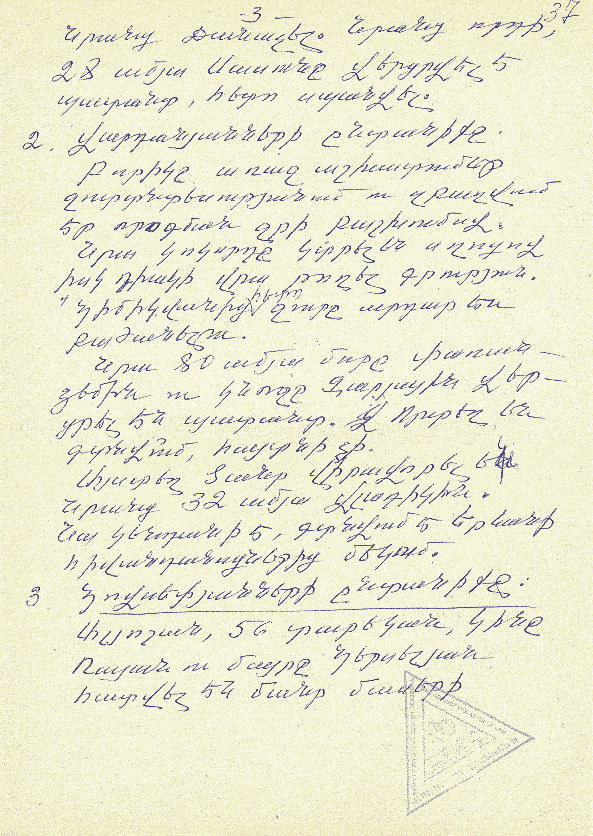 2. Վարդանյանների ընտանիքը. Բորիկը առաջ աշխատում էր ջրտնտեսությունում ու զբաղվում էր ոռոգման ջիր բաշխմամբ: Նրա կոկորդը կտրել են սխոցով, իսկ դիակի վրա թողել գրություն. “ Հիմիկվանից հետո ջուրը արդար ես բաժանելու”: